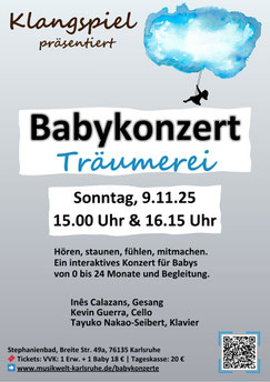 Die Babykonzerte des Ensembles Klangspiel sind ein innovatives Konzertformat für Familien mit Babys von 0 bis 24 Monaten. Das einzigartige Konzept wurde von den Musikerinnen und Musikvermittlerinnen Inês Calazans und Rahel Zinsstag entwickelt und richtet sich mit seiner Gestaltung ganz nach den Bedürfnissen der jüngsten Zuhörer:innen und ihrer Eltern.